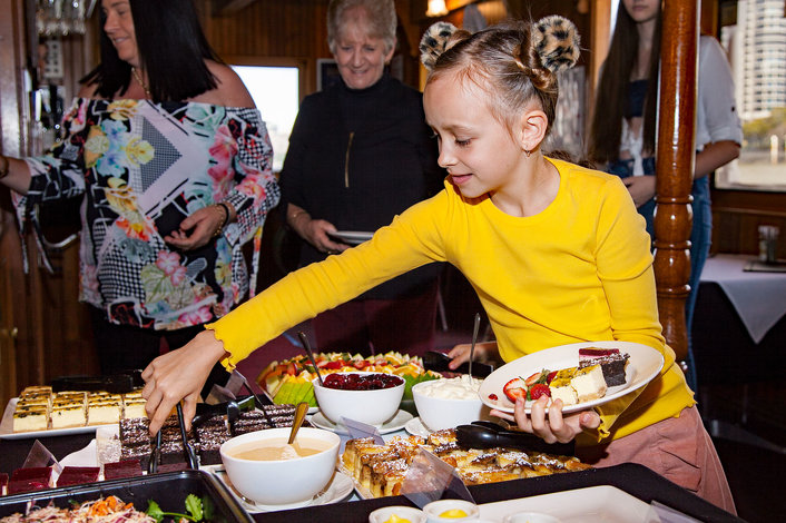 Teens (13-17 years) include buffet meal (as above) + soft-drink & juice Child (4-12 years) includes 2-tier kids stand + soft-drink & juice Infants (3 years and under) free of charge (no meal provided). Must be included in booking. If you would like your infant to recieve a kids meal as outlined below, please book them as a child. Kids menu (4-12 years): Tier 1: Chicken slider, cheddar cheese (G) Pulled beef tartlet (G) Chicken nugget (G) Crispy fries with tomato sauce (G) Tier 2: Chocolate mousse (G) Watermelon (G) Chocolate fondant (G) Fresh Seasonal Fruit Sample menu only, subject to change Vegetarian & Vegan platters available. Must be pre-booked at time of reservation