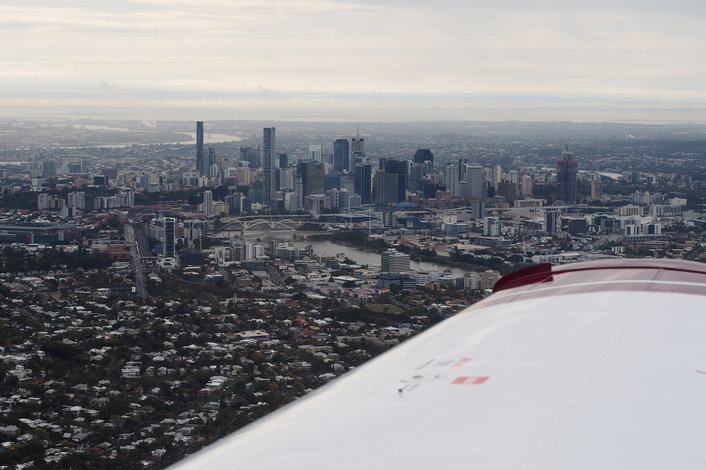 Low-level 30 minute flight experience past Brisbane City and around Mt Coot-tha and Samford Valley